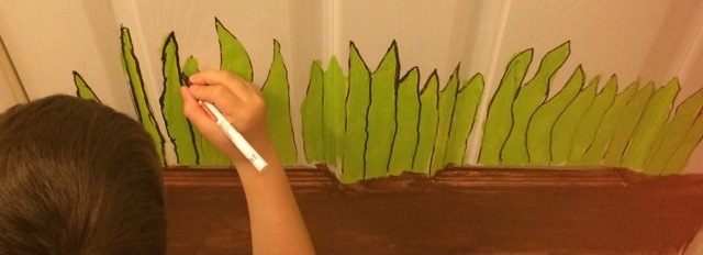 We used Sharpie markers to draw the outlines, and after using craft paint we went over the lines with Sharpie paint markers. We started at the bottom, doing the soil first, then worked our way up to the grass and the flowers.