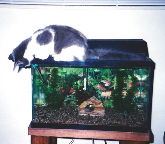 However, I’ll leave you with this. This is a fish we once had, dubbed “Clarabelle” by my granddaughter in around 2012. Although you see Scout as a kitten looking into the aquarium, she was actually not involved in the fish’s demise. In fact, Scout was a kitten in 1998, so the fish she’s looking at isn’t even Clarabelle. The kids really liked the aquarium, and probably paid more attention to it than we did whenever they came over.
