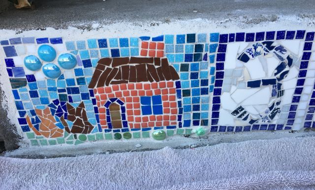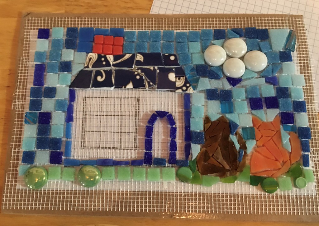 And while I don’t necessarily recommend this, you can usually manage to get mosaic tiles off even after the Thinset has dried. (I found this out when I took the black glass gems off of the sea animals mosaic in the bathroom.) However, it would have been better if I had noticed it while it was still inside on the kitchen table, like I’d done with the cats and the houses. But, that’s how we learn.