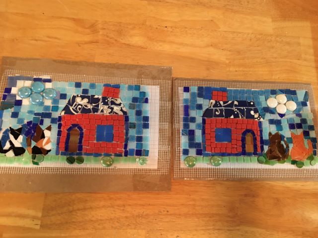 They turned out okay, but I was worried that the blue roofs wouldn’t show up well enough against the blue background. I took off the broken pottery pieces and replaced them with a more “roof-like” color. It wasn’t too hard to get the old tiles off because they hadn’t been glued down for very long. As you will see later, I also changed the cats on the left to match the ones on the right. I didn’t think the calico and black and white showed up as well as the solid colors.