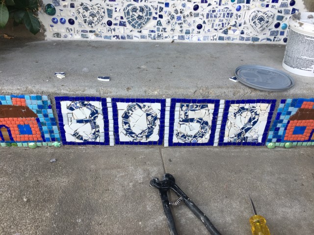 The grouting process is one of my favorite parts! I have to say that it is a little awkward trying to grout a vertical surface when you have to sit on the sidewalk to do it. And, I’ve come to the age now where it’s not sitting down on the ground that’s a problem, it’s getting back up!