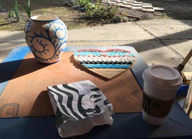 This was from a few days ago, when I decided to clean off my “mosaic table” on the patio. I even washed the dirt off the half-finished heart mosaic that’s been out there for probably a whole year. The blue and white pot is just there for looks, because I didn’t have a place for it in the house.