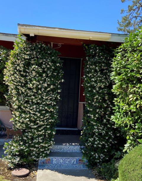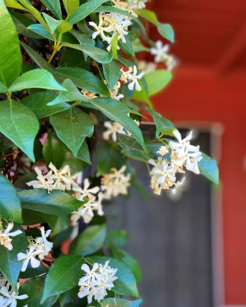 Fortunately I’ve never had problems with the star jasmine by the front porch. Which seems a bit odd, considering I almost never water anything in the front yard. I planted them in around 1992-1993 and they bloom like this every May.