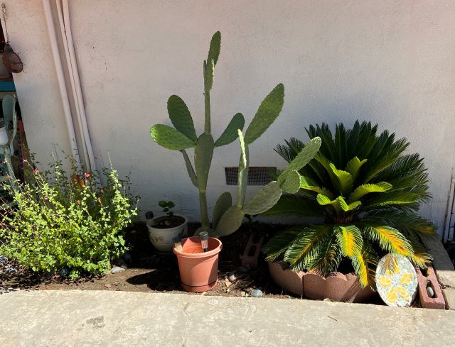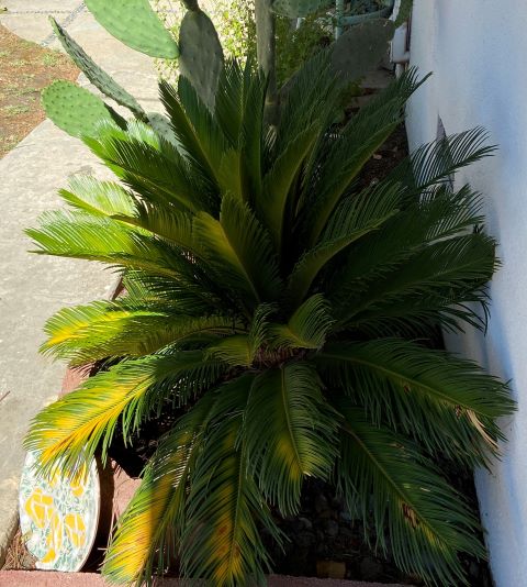 In “Sago Saga” from August 2019 I explained how I thought the sago palm was getting too much sun, so I made it a little shade. Which worked okay until it got blown down by a storm last winter.