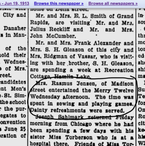 You will remember that in “Newspapers From the Past, Part 1”, I had gotten sidetracked looking for news of the Johnson family and began to wonder what “dainty refreshments” were. I had no clue who Mrs. Rasmus Jensen was, and Chris from Luna’s Online commented that the “Merry Twelve” sounded like a cover for a spy ring.