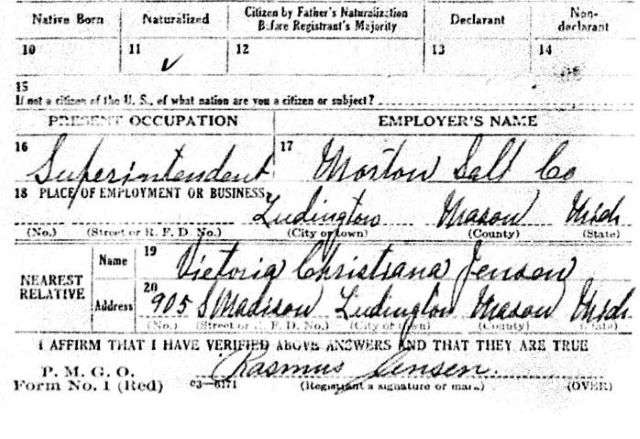 I looked up Rasmus Jensen on Ancestry.com and found that he was the superintendent of the Morton Salt Company in Ludington, and that sure enough, he lived on Madison Street. And his wife’s name was Victoria. But I digress.