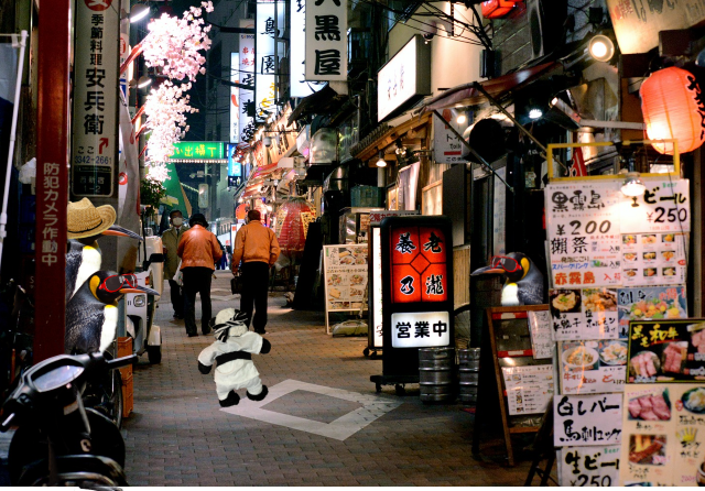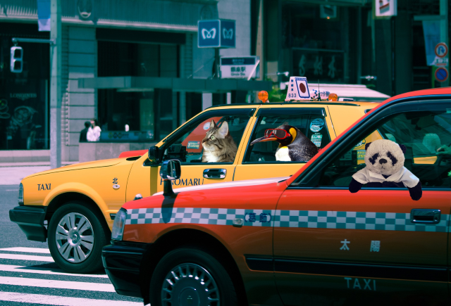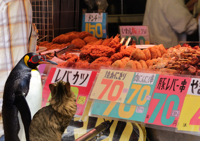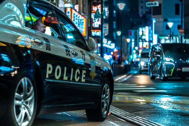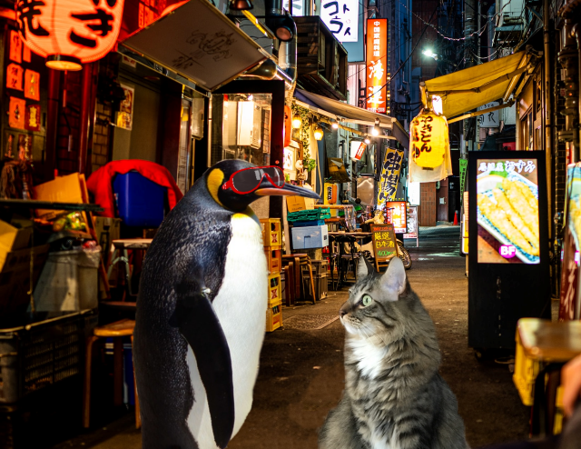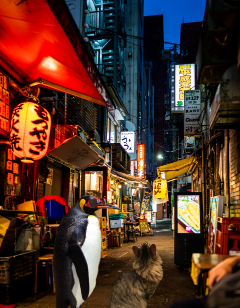 Fortunately when the traffic started moving again, we were able to catch another taxi for ourselves. Since they’d been in Tokyo the penguins had learned Japanese, so this was a great help. “Follow that car!” my friend instructed.