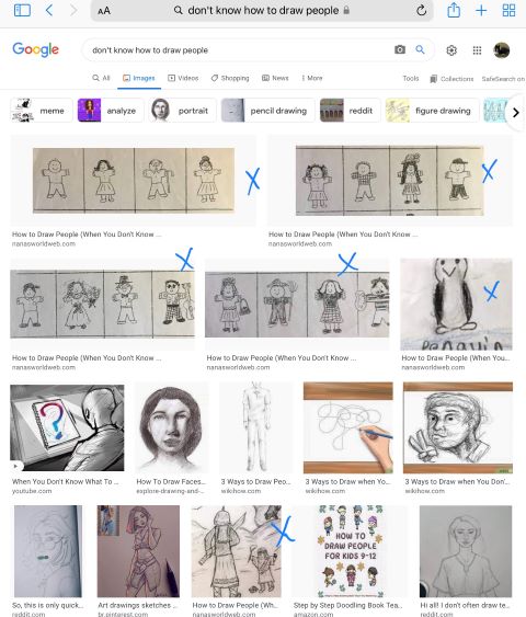 Still, this post probably gets viewed at once or twice every couple of weeks. I have tried to “google” search terms that might bring people to it. It makes the most sense that the search terms would be something like “how to draw people”, but that is not the case. When you search that topic, my blog is nowhere to be found. But if you search “don’t know how to draw people”, and then my post will be the first thing that pops up.