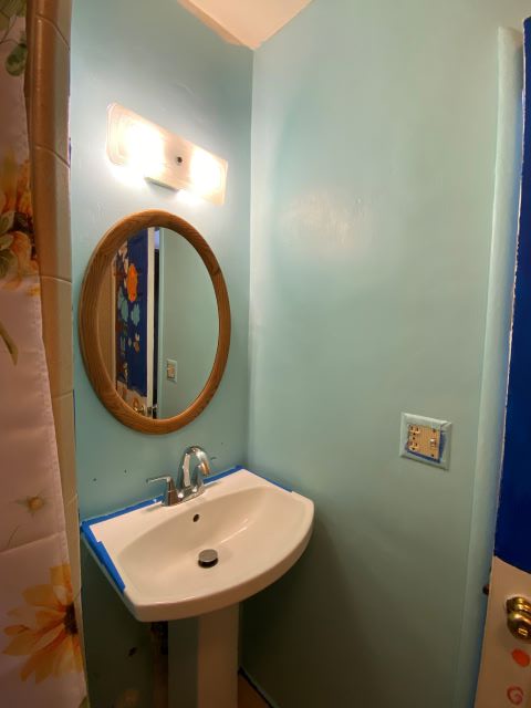 Unbeknownst to me, the sample can of paint isn’t exactly the same as the “real” paint. According to the paint department people, sample paint doesn’t stick on the wall as well, among other things. Not knowing this, I had used the sample to paint the area around the sink, only to find out that I had to go over it again.