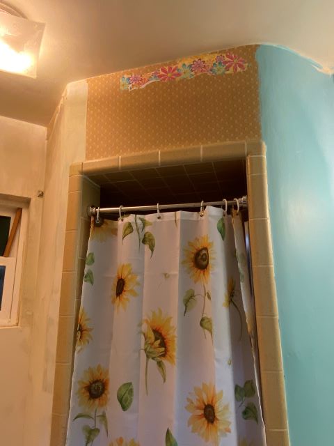 The shower was now ready for its new, sunflower themed curtain! Don’t ask me if I’ve been tempted to do a mosaic on the shower walls! I’ve already thought about it, but if I did, I think I would do sunflowers instead of sea animals.