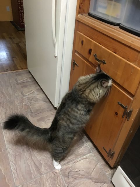 When I was little, my main technique was putting things in my food dish, like this catnip fish.