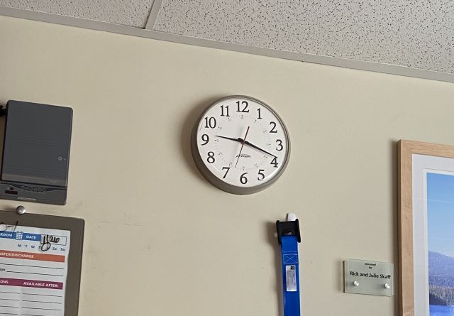 “So before she knew it, Mom was done with her operation and she got to be in her own room until the next day. She could have gone home the same day, but she had arranged to stay all night, to be on the safe side. Look at the great view she had from her window!” Panda nodded in approval. He looked at the next photo. “I suppose she thought the clock was crooked?”