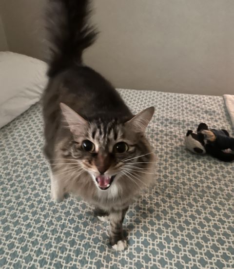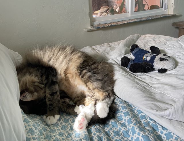 Panda voiced the question as we looked through the photos on Mom’s phone after she came home from her surgery. “I would never hiss at Aunt Karen,” I replied, feeling a tiny bit offended. “I was meowing ‘Hi’ to her when she came to check on us Thursday afternoon.”