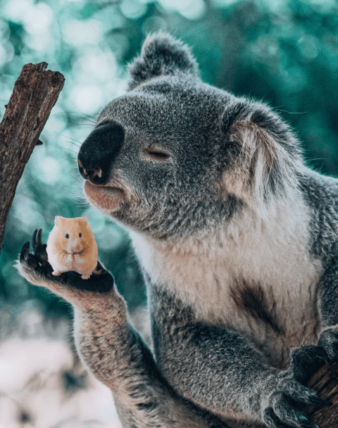 “I’m a hamster,” our friend replied as the koala picked him up with its back paw to get a closer look. “I’ve never seen a hamster before,” the koala said, sniffing him with interest. “Would you like some delicious eucalyptus leaves?” The hamster told us he had been a little bit scared, but he replied calmly, “Umm, no thank you. But do you think you could put me down now?” The koala complied, and our friend was soon on his way again.