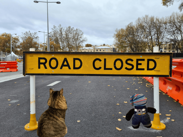 We said goodbye to the hamster and started for the airport where we had left our trampoline. We were surprised to see that the road was closed, but since we could fit under the sign, we kept walking. Unbeknownst to us, we were in for a surprise.