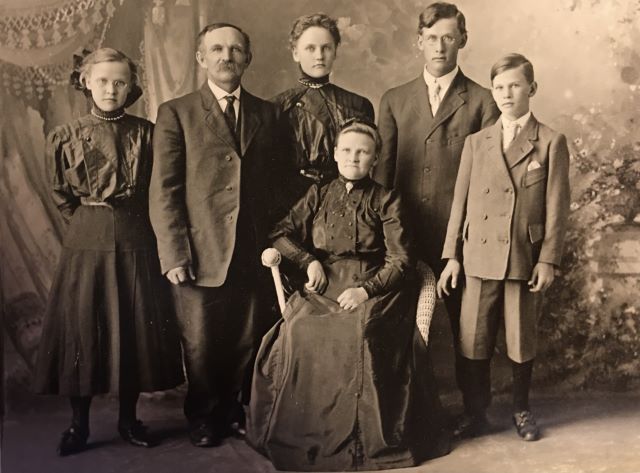 This is one of my favorite family pictures. It’s Ole and Marie Anderson with their children, (L-R) Lydia, Jennie, Andrew and George. I’m not sure of the date, but George (my maternal grandfather), was born in 1897 and he looks maybe fourteen here? You might remember George from two previous posts, “Oceans of Love” and “As Ever, Geo”. I’ve always been fascinated with the hairstyles and clothing from “back in those days”. It looks to me like Marie’s dress is made of silk or satin. Since it’s not in color, I’m guessing the dresses are black, but for all we know they could have been navy blue or maybe a dark brown or purple.