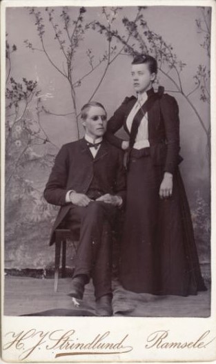 The woman on the right (in the photo on the left) is my grandma Edla’s mother, Charlotte Nelson. I don’t know who the other lady is. The photo on the right is my grandpa Emil’s mother, Anna Caroline Johnson. Their dresses are all similar, except that Anna Caroline’s doesn’t have puffed sleeves. Notice the “hourglass figures” on all three of them. Corsets, maybe? I also think it’s interesting that at a time when women rarely cut their hair, bangs seemed to have been in style, at least for awhile.