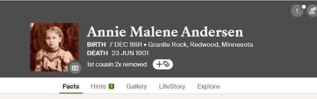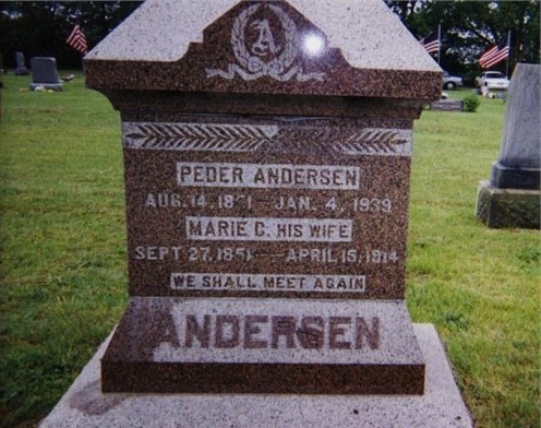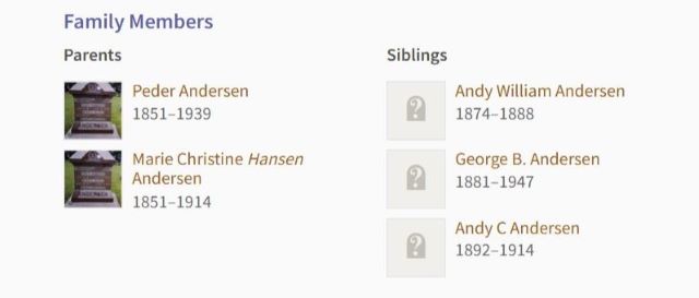 Of course I had to look on FindAGrave.com, and that’s where I realized that not only did the parents’ birth and death dates not match, but this Peter’s wife was named Marie Christine, and her maiden name was Hansen. Our Peter’s wife was Ane Marie, and her maiden name was Christenson. I guess if you just glance at the information, (Anderson, Peter, Marie, Mary, Christine, Christenson), it could be confusing. What’s sad is that Marie Christine died in 1914, the same year as one of her sons. Now I’m curious, but that’s another rabbit hole altogether. Besides, is it really any of my business?