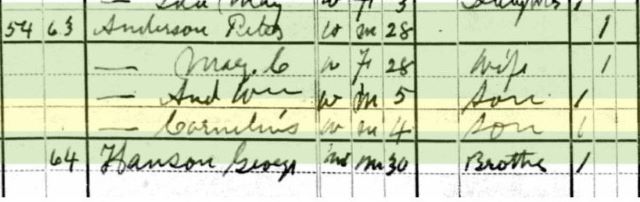 Imagine my surprise when I discovered a photo of two little Anderson boys I had never heard of before in someone’s public photo gallery. Their names were Cornelius and Andy. I thought it was a bit odd that they weren’t in the group photo you saw at the beginning of this post. But they were included in a family tree with Peter and Ane as the parents, along with all the rest of my “first cousins twice removed” as siblings. This is what I found when I checked the census data for 1880 from this tree.
