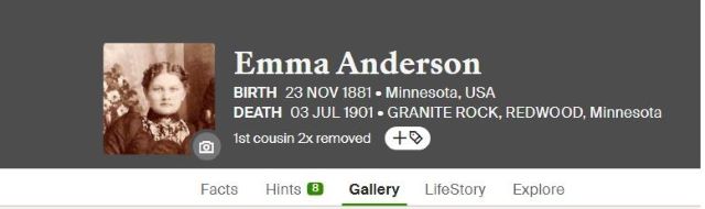 I found this in the Redwood Gazette for July 3, 1901, the same day Emma died, but it’s for a son, not a daughter. And who knows how many Mrs. Andersons there could have been in Granite Rock, Minnesota in July of 1901?