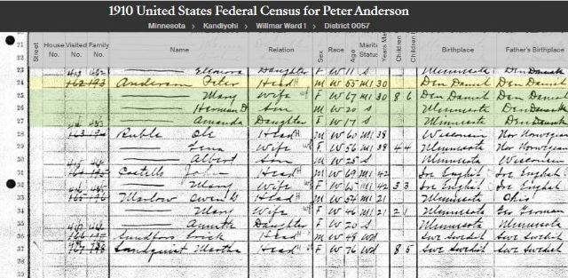 According to the 1910 census, Peter and Ane were in Kandiyohi County, Minnesota, with Herman, age 20, and Amanda, age 17, still at home. They weren’t farming anymore, and though you can’t see it here, Peter was listed as a laborer, doing odd jobs. What’s incorrect about this entry is that Peter was 65, not 55. Peter was born in 1854 and Ane in 1852. You will notice that Ane Marie was listed as Mary, and she was mother to 8 children, 6 of whom were still living. Just in that small screenshot you can see two other women who had lost at least one child. For more information on that, see “The Day of Adversity”. Ane Marie died in Granite Rock in 1915, but Peter eventually went to Canada, where he passed away in 1941. I still have a few questions about this branch of my family, but I was glad to have gotten this far. The info I needed for this post was (almost) complete. I just had a few more things to find out…