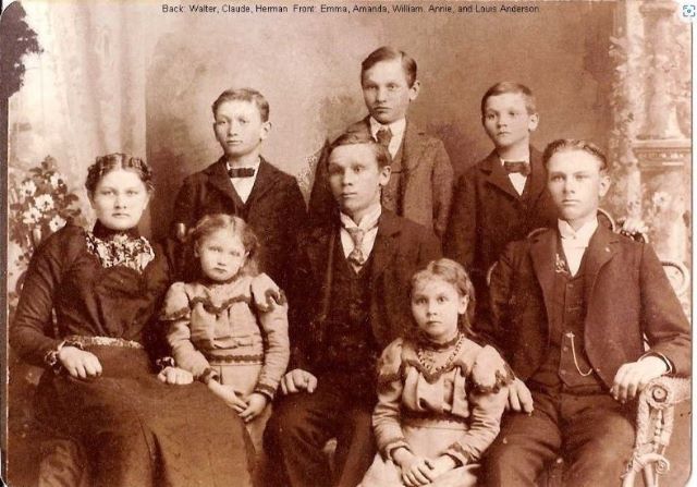 On the left you can see those children’s parents, Peter (Peder) Anderson and his wife, Ane Marie. Peter’s brother, Ole Anderson, is pictured with his wife and children. That’s my maternal grandfather, George, on the far right. I think Peter and Ole look a lot alike. For more on that, you can read “Seeing Double”.