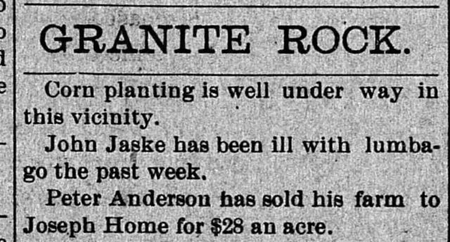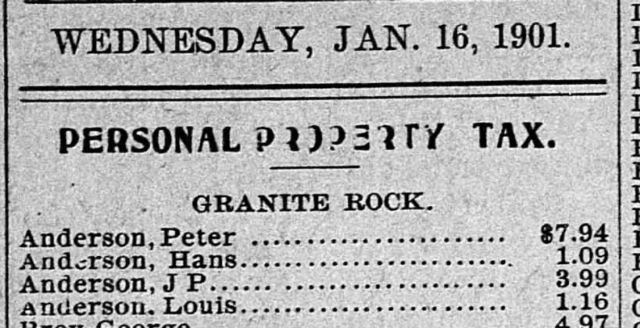 Because I “had” to find out more about Peter and Ane, (which I felt was my business) I searched through Newspapers.com for references to Granite Rock, Minnesota, from about 1899 to 1905. If you search the name “Anderson” from Minnesota, you’ll be inundated with articles about people you aren’t even remotely related to. (Or maybe you are, and don’t know it.) I can only assume this is Peter from our family, and you will see that in January of 1901 his property taxes were $7.94. Louis Anderson could have been the “L. Anderson” who was to lose a teenage daughter to diphtheria that July.