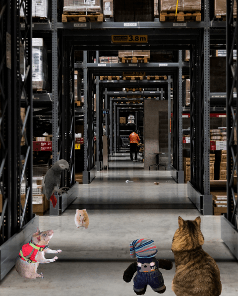 After a brief search we found a door that led into another part of the warehouse. We could hear a lot of birds chirping and squawking in the distance. “This must be where they put my friends!” the parrot exclaimed. “Come on, guys,” the hamster said. “I think we’re getting close to finding them!” Spike sniffed the air thoughtfully. “I think you’re right,” he replied. “Let’s go!”