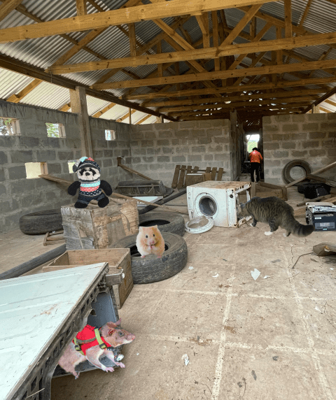 When we got to where Foster and the hamster were waiting, Spike climbed up onto one of the birdhouses along the wall. “Hey guys!” he whispered. “We’re here to rescue you. Everybody be really quiet. We’ll have you out of here in no time.” The birds were overjoyed. “Yay!” they said, as quietly as they could. “We knew APOPO wouldn’t let us down!”