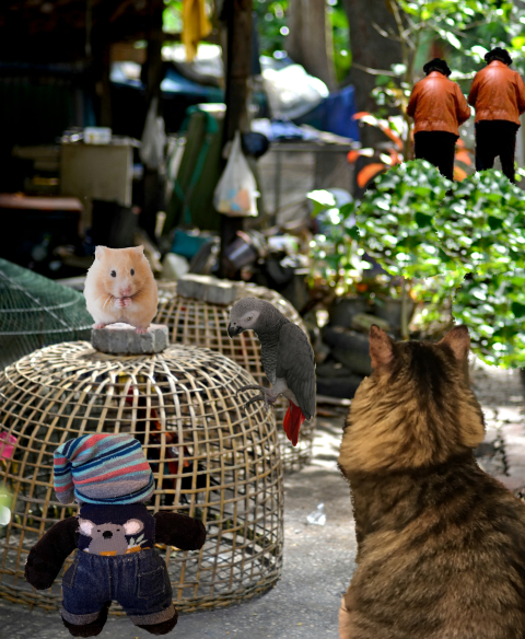 We decided to split up so we could cover more ground. I went with Spike and the parrot, and it wasn’t long before we found some shelves with birdcages on them. Spike went up and sniffed them carefully. “Yep, these guys have been poached, all right” he announced. “I’ll text Andre to bring the police.”