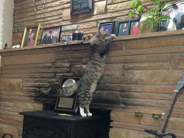 That’s probably going to be because your cat wanted to help (un)decorate when he was a baby. What can I say? As Panda asked in “Happy Cattiversary”, “Is this why we can’t have nice things on the mantel?”