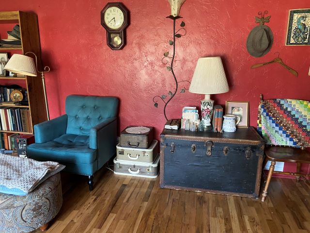 My front living room has two walls this color, which I think is plenty. It’s my “vintage-themed” room, and I like it a lot. I’ve also read that themed rooms are “out”, because they can look too “staged”. But what do people do when they want to sell a house? They “stage” it.