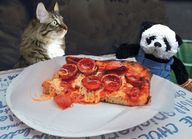 “This is sure a big piece of pizza,” Panda commented as we sat down. I agreed. “People who have been to New York City have told Mom that you have to try the pizza if you come here,” I replied. We both agreed that the pizza was delicious. “It could have used a few delicious bamboo shoots,” Panda said, “but other than that, it was great!”