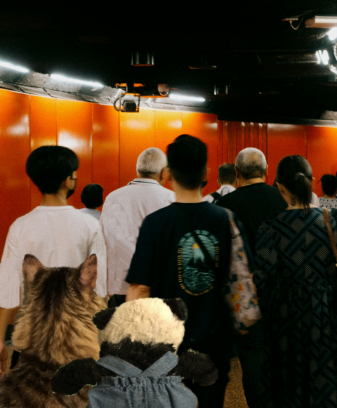 Once we got to the bottom of the stairs, we followed the crowd down a long, orange passageway. Everyone was talking about the entry fee to the bridge. “They didn’t charge us last time we crossed the bridge,” one man grumbled irritably. “I didn’t read anything about this in the tourist information,” said another. Panda and I were starting to get a little suspicious, but by now we were almost to the end of the passage.