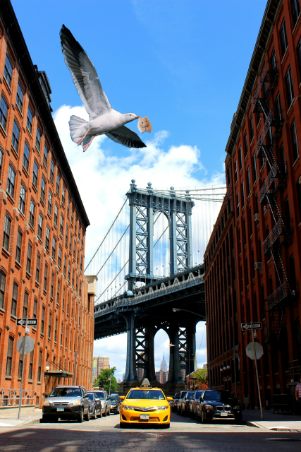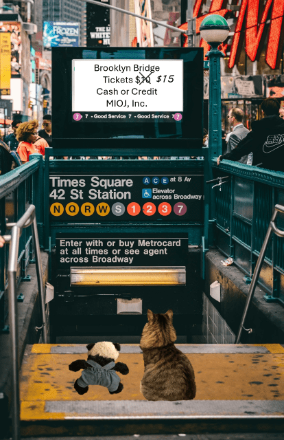 We found a subway entrance and looked down the stairs. “That’s pretty far down,” Panda said. “But I guess we have to go down there if we want to get our tickets to cross the Brooklyn Bridge.” I looked at the information scrolling across the screen above the entrance. Ten dollars sounded like a lot to just walk across a bridge, but, since we were already here, we decided we’d might as well go for it.