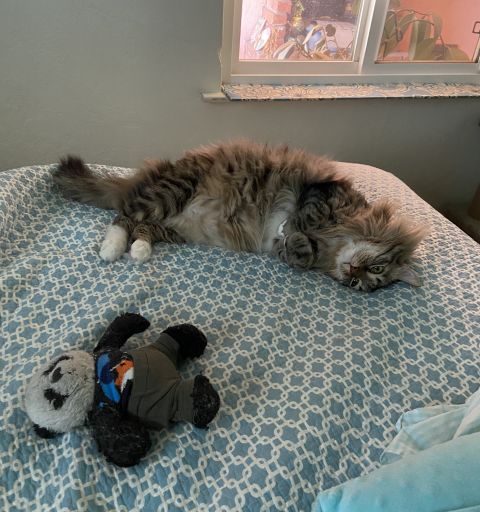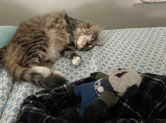 Ahh, this is the life. Here I am with my best “Maine Coon” sleeping face. But what was in The Box, and why was it staying in the front room so long without Mom opening it? This was a topic of much conversation between Panda and me over the next few days.