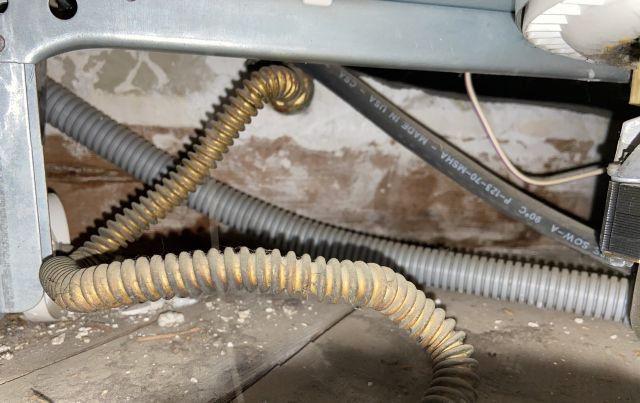 Antonio set up an appointment for Tommy to come and take care of the problem with the water line. In order to do that, Tommy had to remove the dishwasher, which was no easy task, because of the way it had been stuffed into the space behind the linoleum. Then, while he was working on the water line, he found that the hot water pipe leading to the dishwasher was partially blocked inside by corrosion, and he asked if we had low water pressure.