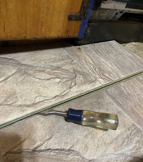 “Wow!” Panda exclaimed, when we looked at the linoleum that was under the laminate. “It looks like somebody had to cut the old linoleum to be able to install the dishwasher!” I nodded. “Well, it’s been there for the past 27 years,” I commented, “so who knows?”