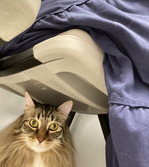 After an attempt to get back into my carrier, which Mom, for some reason, thought was hilarious, I decided to wait for Dr. Duran under Mom’s chair.