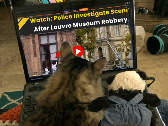 “Brazilian Louvre robbery crew may have been hired by collector,” Panda read when I clicked to the next screen. “But why would they come all the way from Brazil?” I tried not to laugh as I corrected him. “It’s doesn’t say Brazilian, it says brazen. Brazen means right out in the open without trying to hide it. They just ran in and took the jewels and left, in broad daylight.” Panda looked a bit perplexed. “That doesn’t sound like it was very smart,” he commented. Suddenly we looked at each other, and we knew we were both thinking the same thing. “We’d better go back to the Louvre!” we exclaimed in unison.
