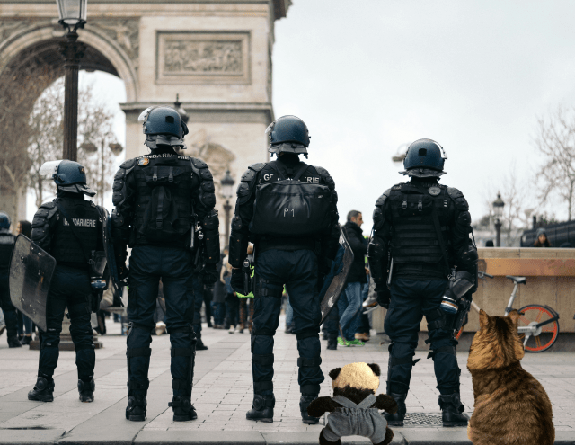 Then suddenly, Panda jumped down from the bus window and ran up to stand behind the French police officers! I followed, knowing it was my responsibility to keep him from getting lost. Behind us we could hear an officer saying something to the bus driver in French, and the bus continued down the street, leaving us in a cloud of diesel exhaust. Inwardly mumbling about Panda’s disregard for the “element of risk”, I tried to hear what the men in front of us were saying. I thought I caught the French phrases, “les hommes” and “vestes orange“, but I couldn’t be sure.