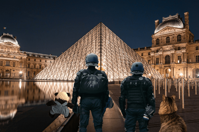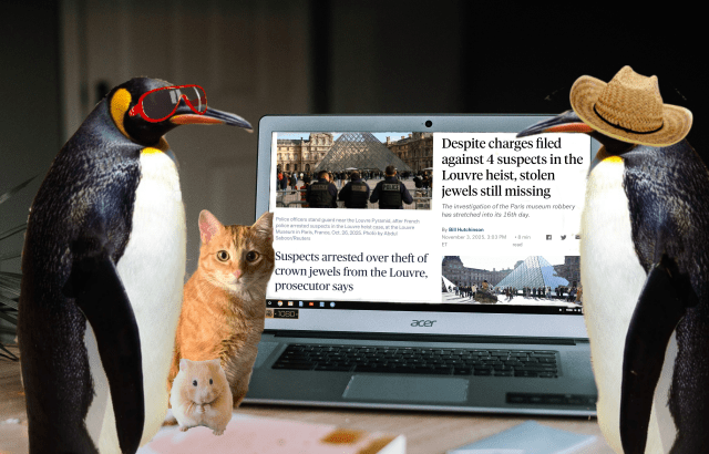 But while they were waiting for their food, something shiny under one of the chairs caught their attention. As they moved closer to investigate, they saw a pile of colorful jewels. Thinking it must have something to do with the heist at the Louvre, they scooped them up and put them in their pockets for evidence.