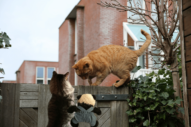 Before I could reply, we found ourselves landing in somebody’s back yard! We were wondering how that happened when we heard a voice from the fence above us. We looked up to see a large, orange cat eyeing us curiously. “Who are you?” the cat asked, briskly though not in an unfriendly manner. Then he turned his attention to Panda. “Are you a real panda or a stuffed animal?” he demanded. “And is that a real pocket?”