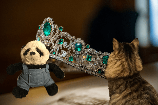 Soon we came to a lovely tiara made of diamonds and sapphires. “I want to see this close up,” Panda said, jumping over the glass and into the exhibit. “Panda!” I exclaimed. “Get out of there! You’re going to get in trouble!” But it was too late! I heard a voice behind me saying, “Attrapez-le!” Get him!” Before I knew it, a police officer had grabbed Panda and was taking him outside!