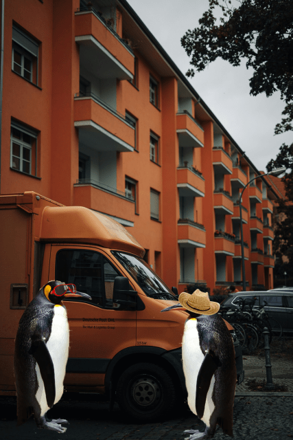 Meanwhile, our friends, realizing there was nothing they could do to stop the bus, continued to the end of the line and found themselves downtown. The penguins told us later that they had decided to stop at an outdoor cafe for a snack. At first, they didn’t notice anything out of the ordinary, other than the lack of customers, and the fact that the entire cafe was orange.