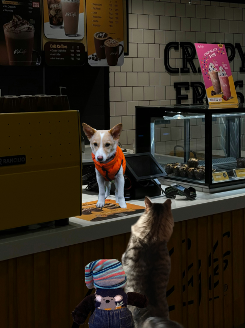 The dog in the orange jacket had been a stray on the streets of Sydney, Australia when he was picked up by the MIOJ and forced to be their dog. Foster and Panda first met him at a McDonald’s, where he had been told to stay while his owners were at a meeting in the back. Wanting to get away from his unfriendly owners, he joined Foster and Panda in search of their flying trampoline, which had been towed away by airport police.