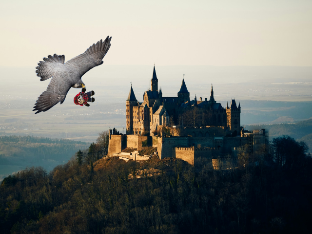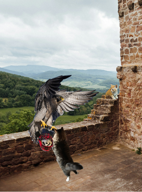 Lady Felicity turned out to be beautiful, and she was very nice. Her falcon was eager to help and wanted to leave right away. After a brief discussion it was decided that Panda should be the one to go with the falcon, since, after his many experiences with birds, he had long ago ceased to be afraid of being carried through the air by them. Before we knew it, the falcon had picked up Panda in his beak, and we watched them disappear into a mere speck against the sky.