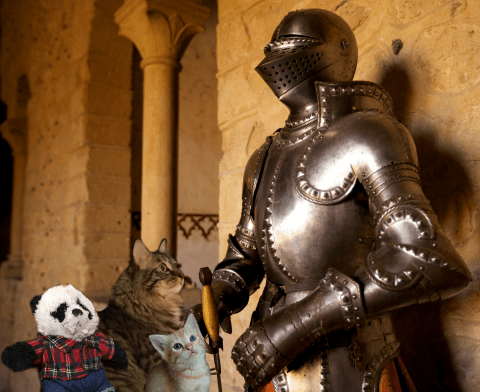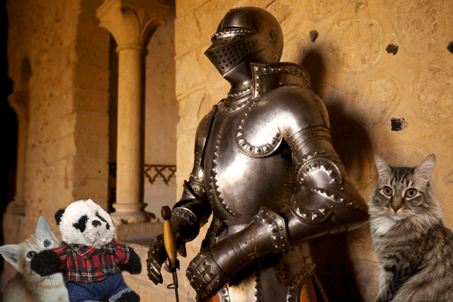 “May I help you?” The deep voice sounded slightly amused. Suddenly we realized that in the commotion of seeing Little Alexandre, we had forgotten about the metal man! We all jumped when he spoke again. “My name is Sir Grimald. I live in this castle. And who, pray tell, do I have the pleasure of addressing?” We introduced ourselves and explained the reason for our visit, to which Sir Grimald listened with interest. Then Alexandre spoke up timidly. “Please, sir,” he asked, “But are you really made out of metal?” Our new friend laughed heartily. “Oh no, I’m just wearing my armor today. I usually wear it when I’m on guard here in the castle.”