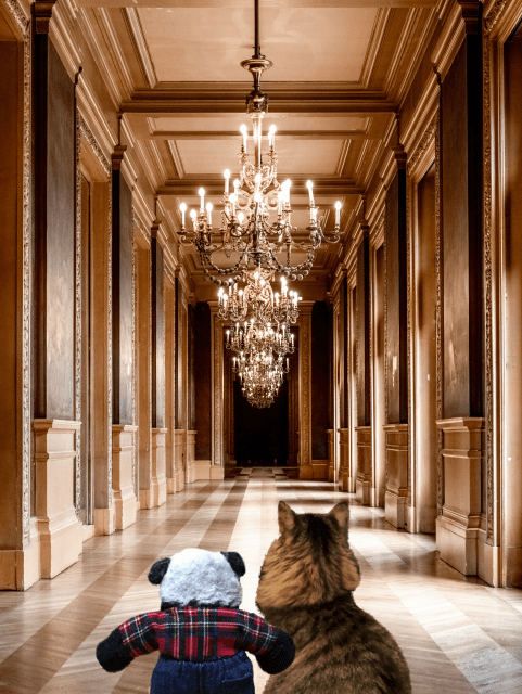 “Hello?” said a voice at the end of the hall. Imagine our surprise when we almost bumped into a man who looked like he was made out of metal! I jumped aside, and Panda threw out his arms and backed up in alarm. “Ow!” said a small voice behind him. It was Little Alexandre, whom he had accidentally hit in the nose. “Alexandre!” we exclaimed in unison. “How did you get here?” Alexandre sounded a bit out of breath. “I wanted to come with you instead of going with the others,” he explained. “I followed you, but you were going too fast and I almost got lost. I have only now caught up with you.”