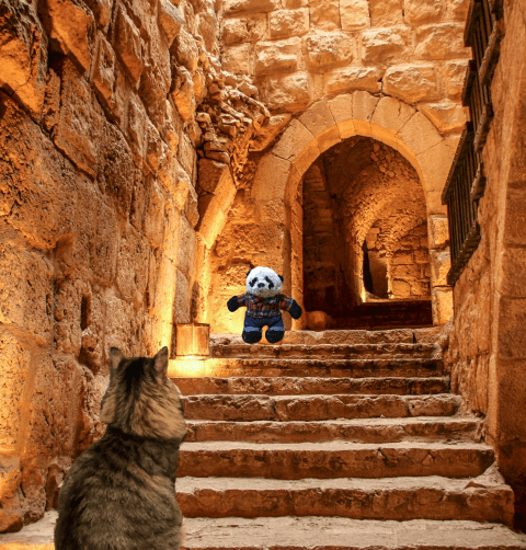 By the time I caught up with him, Panda was already inside the main door. There were stone steps leading to what looked like some sort of a passageway. “Dude,” he said, his voice echoing along the stone walls. “This is so cool! It’s a real medieval castle!” I hesitated. “Umm, I don’t really want to go in there if it’s evil,” I said doubtfully. Panda laughed. “I said medieval, not evil,” he said. “Medieval times were like the 1200s, when there were knights in shining armor and damsels in distress. I read about it online. Let’s go inside. It’s perfectly fine.”